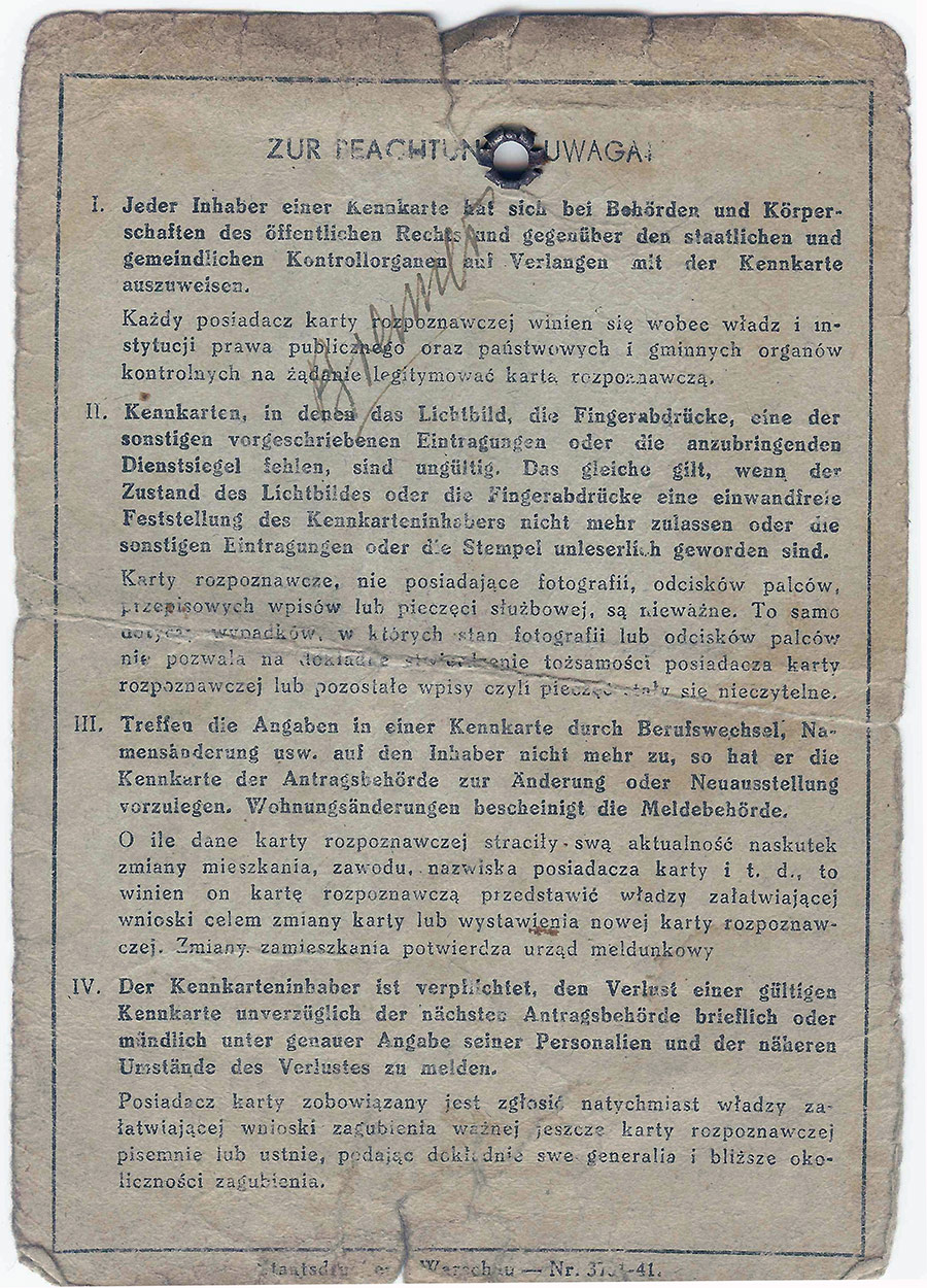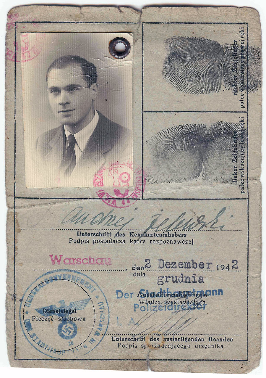 The identity card issued under Nazi occupation in Warsaw. It bears the name of Andrzej Zalewski adopted by my father during the wartime, which became his permanent name afterwards.