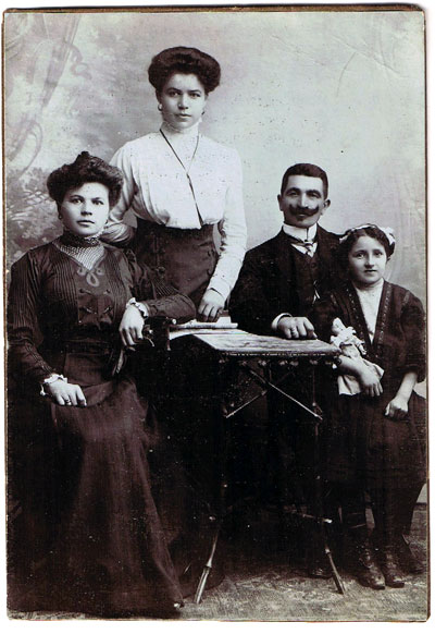 Left to right: Carolina Sobolewska Kubas (1888-1964), Wilhelmina Sobolewska Durkalec (1892 -1972; standing), Franciscus Kubas, and Mania Kubas in a photograph from the beginning of the twentieth century.
